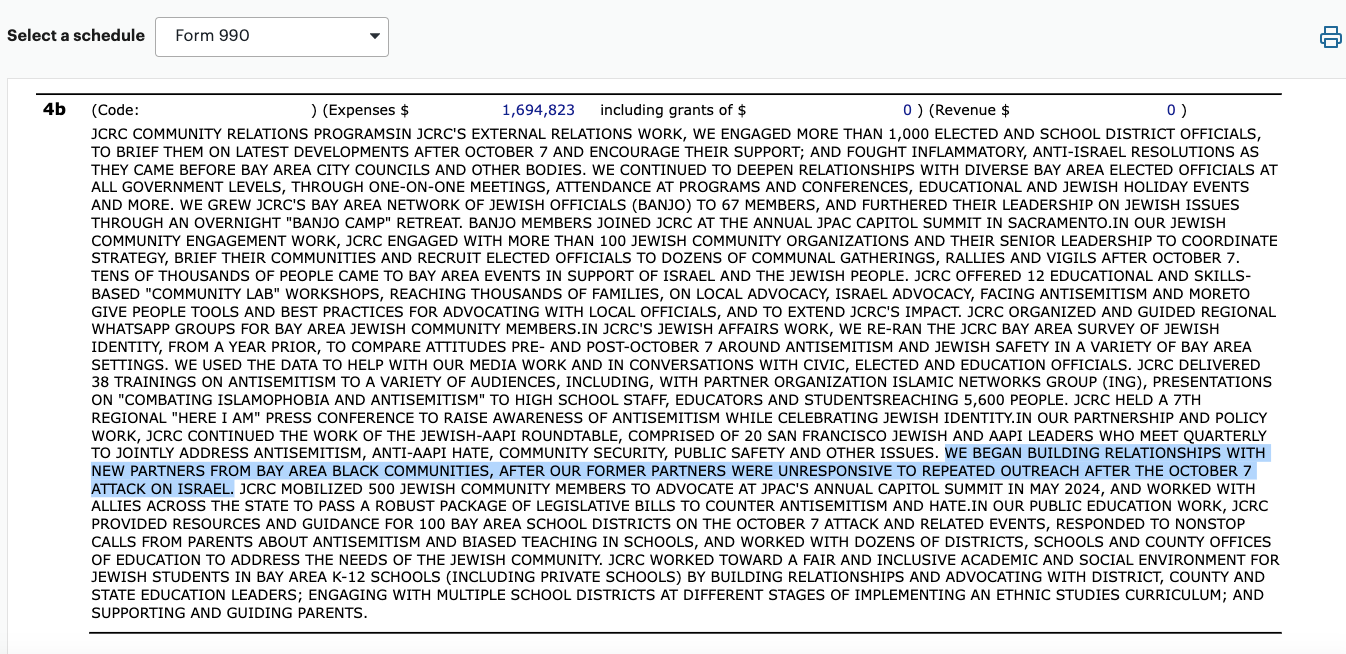 As cited earlier, the JCRC description then mentions that the Bay Area's Black community was insufficiently responsive to the feelings of the pro-Israel JCRC's cohort post-October 7, a condition that required dumping old partners and "repair". What sort of incompetent leadership would include that on an IRS Form 990? How long is it going to take the JCRC to replace Tyler Gregory and Jonathan Mintzer with more responsible leadership?