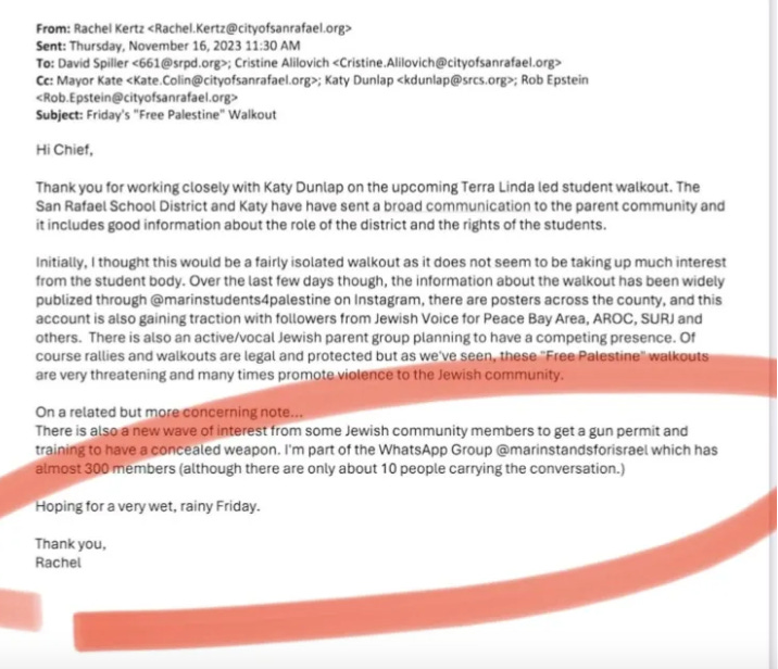 In the same item, the JCRC mentions their coordination of the WhatsApp groups for pro-Israel Jewish community members, but does not include the reality that, as JCRC BANJO Co-Chair Rachel Kertz was obliged to report to the San Rafael police chief, the pro-Israel WhatsApp group members in Marin discussed the need for "concealed weapon" permits. Their desire for concealed weapons was in response to a peaceful high school student walkout conducted by some of the sweetest, most earnest kids you’ll ever meet. That’s right, Kertz had to rat-fink her own gun-crazy pro-Israel cohort to protect the innocent teens protesting Israel’s genocide. That concealed carry demand is the level of paranoia that the JCRC's "community relations" stoked.