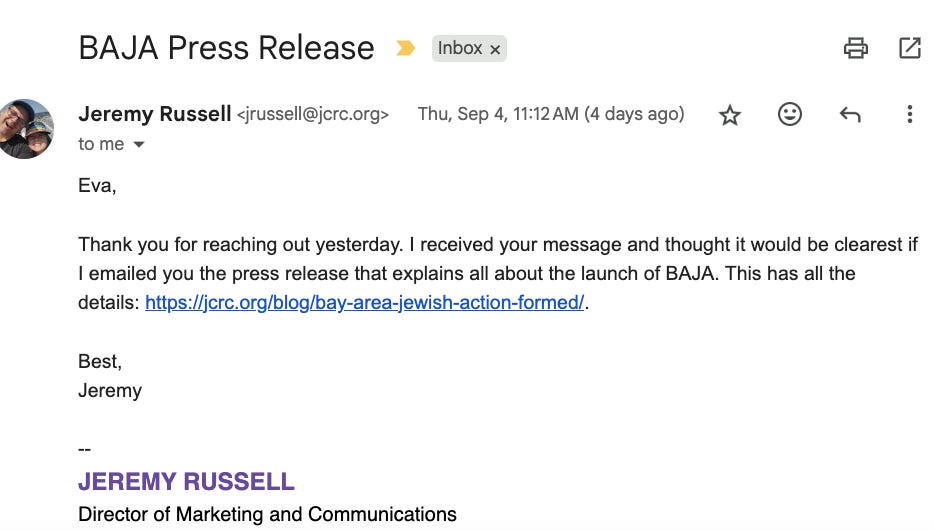I reached out multiple times to the JCRC last week with questions about their lobbying. The only response I received was an email from the JCRC's Director of Communications and Marketing, Jeremy Russell. In that email, Mr. Russell shared a year-old press release about the JCRC's formation of a new group, a 501(c)4 called Bay Area Jewish Action (BAJA). This 501(c)4 category would allow JCRC principals greater latitude in lobbying. (BAJA is considerably more opaque than the JCRC, but from what is publicly available, it appears to be engaged in the same lobbying activity that the JCRC has been involved in.)