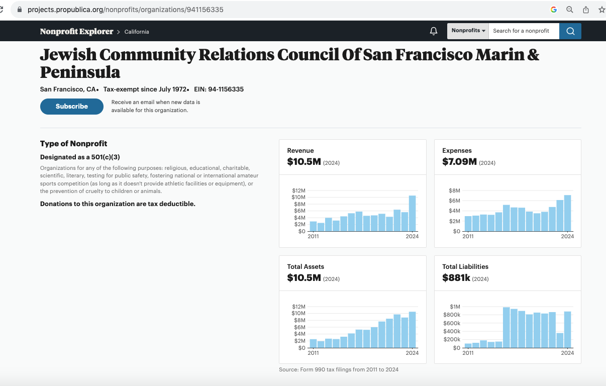 A review of JCRC's Form 990 filings over two decades begs the question: Has the SF Bay Area JCRC always skirted IRS caps on lobbying expenditures? Is that why JCRC formed a new 501(c)4 in late 2024?