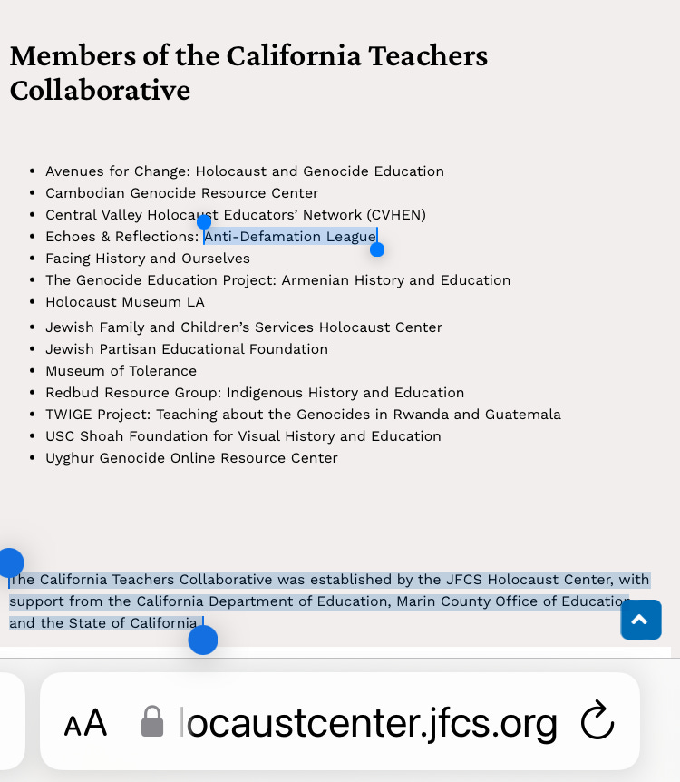 Before the meeting, I had received a tip from pro-Palestinian Jewish activists to check the groups involved in the JFCS Holocaust Center program. And there it was: the ADL, involved in JFCS Holocaust Education Center’s “California Teachers’ Collaborative”, established “with support from the California Department of Education, Marin County Office of Education, and the State of California.”