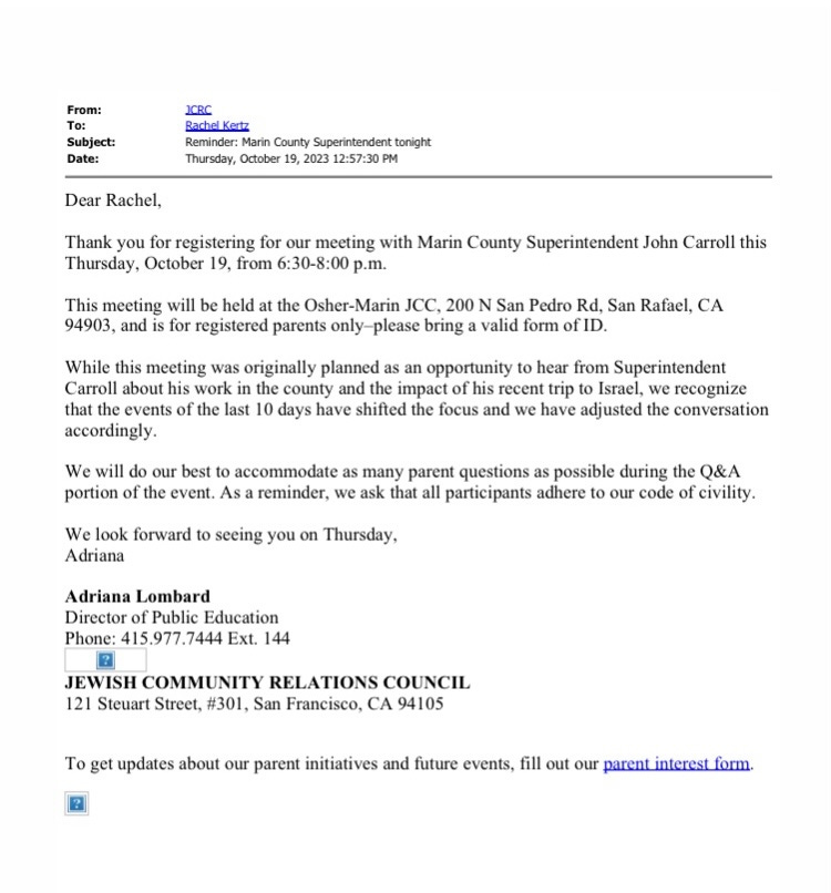 Let’s first examine the CPRA’d email that initially informed me of Carroll’s trip, which was delivered to me on June 13 by the San Rafael City Clerk’s office. It’s dated October 19, 2023, and signed by SF JCRC’s Adriana Lombard, to San Rafael City Councilmember Rachel Kertz, with the subject heading: “Reminder: Marin County Superintendent tonight”. The email, which was sent twelve days after the October 7 attacks, informed Kertz about a slight change to an appearance by John Carroll at the Osher Marin JCC: