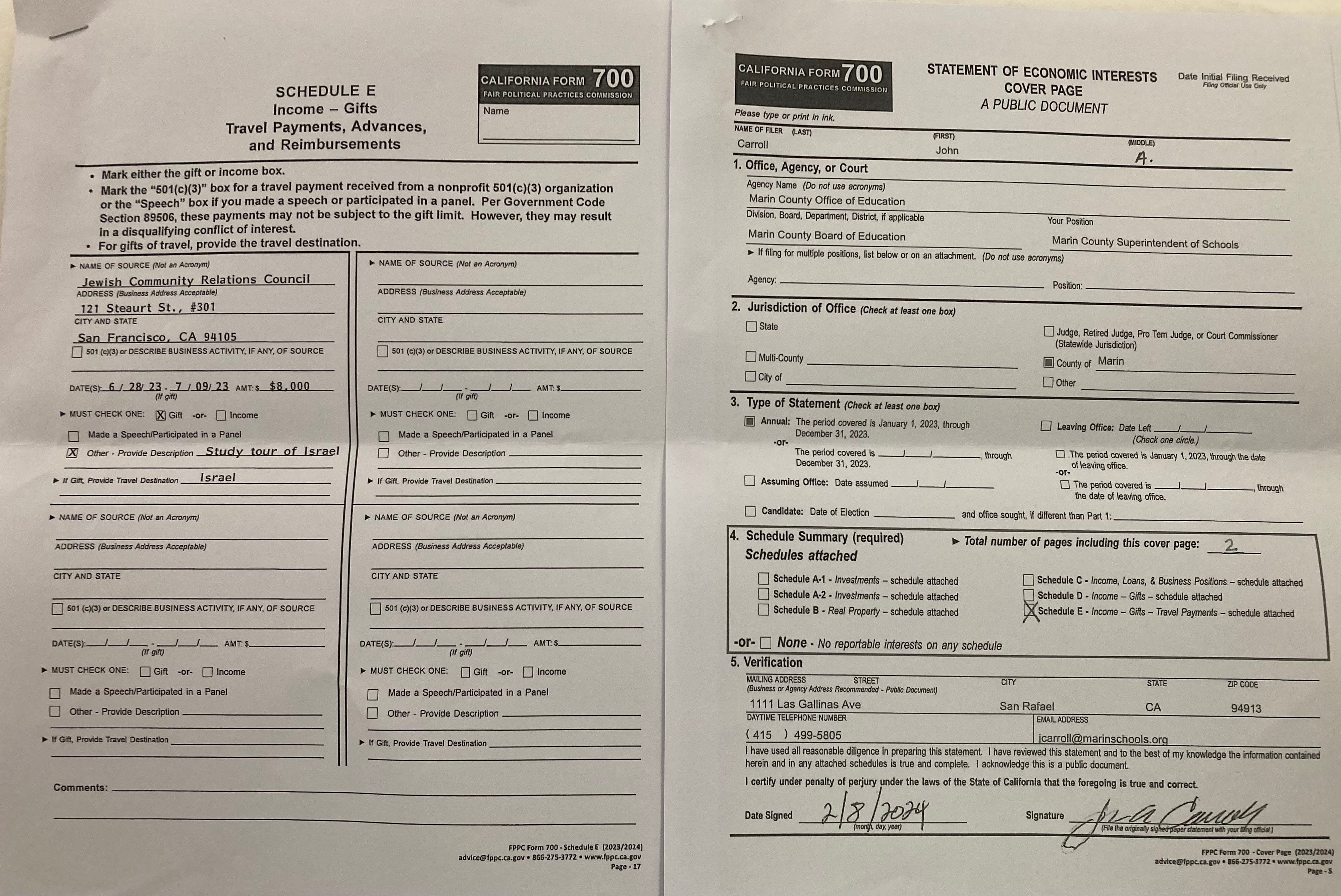 One of the first things we discussed was his 2023 Form 700 (Schedule E), which I did not receive until I showed up at Carroll’s office. The form shows that Carroll accepted only one gift in 2023, it was for a “Study tour of Israel” from June 28, 2023 to July 9, 2023 (12 days), paid for by the SF JCRC, to the tune of $8,000. This is nearly twice as much as the cost of the JCRC-funded trips to Israel that Tiburon Councilmember Holli Thier and San Rafael Councilmember Rachel Kertz had taken earlier in 2023.