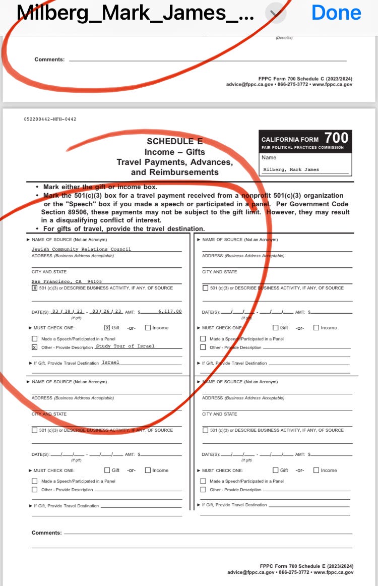 The higher amounts paid for Carroll’s and Milberg’s trips caught my eye thanks to sharp reporting in CalMatters, which had informed readers of a general compliance problem with nonprofit-paid junkets. I note that there are considerable loopholes in the 2015 legislation mandating this disclosure, which SF JCRC may be using.